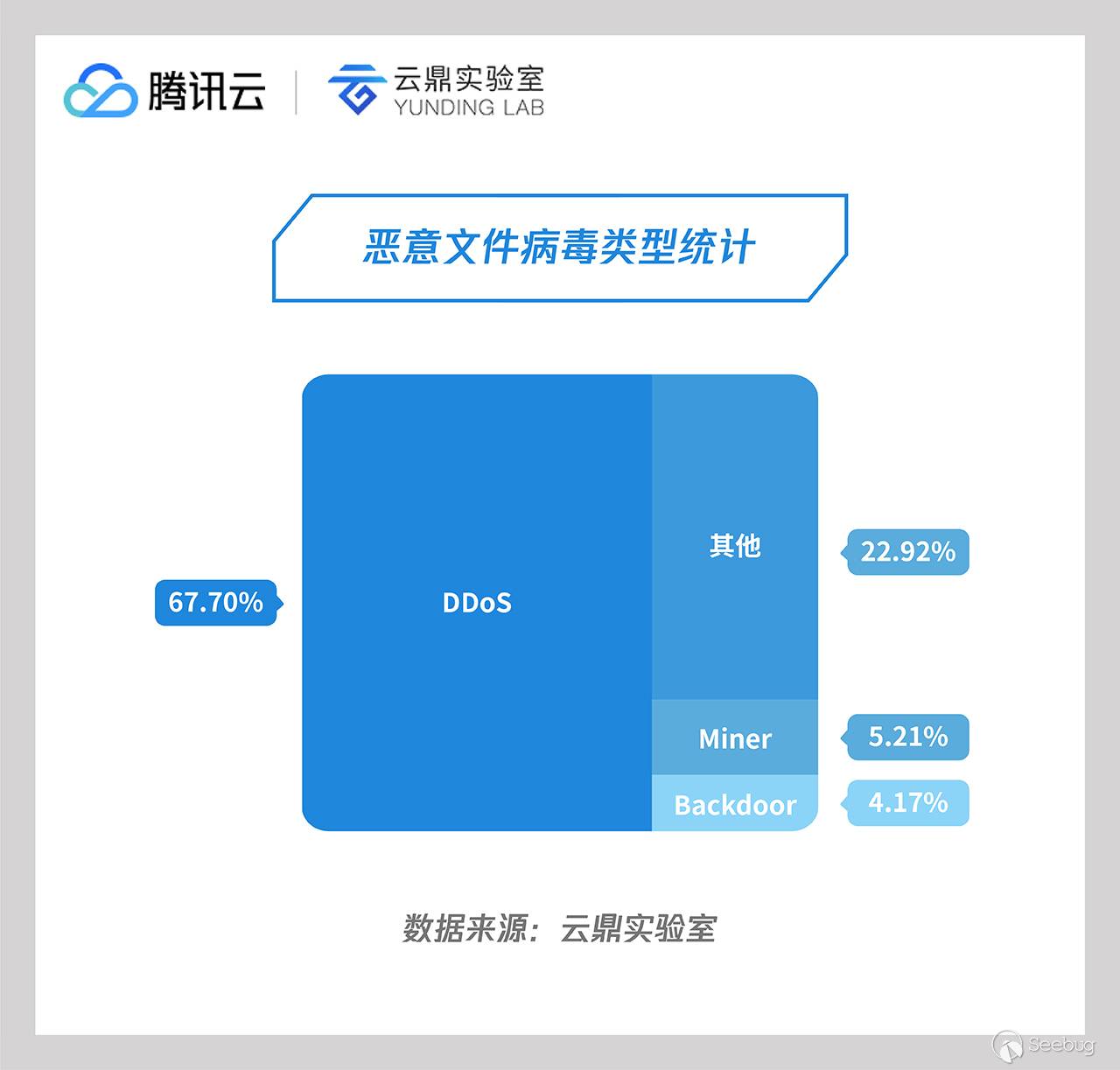 植入的惡意文件中反病毒引擎檢測到病毒占比43.05%,病毒文件中屬 DDoS 類型的惡意文件最多,接近70%,包括 Ganiw、 Dofloo、 Mirai、 Xarcen、 PNScan、 LuaBot、 Ddostf 等家族。另外,僅從這批惡意文件中,就發現了比特幣等挖礦程序占5.21%,如下圖所示: