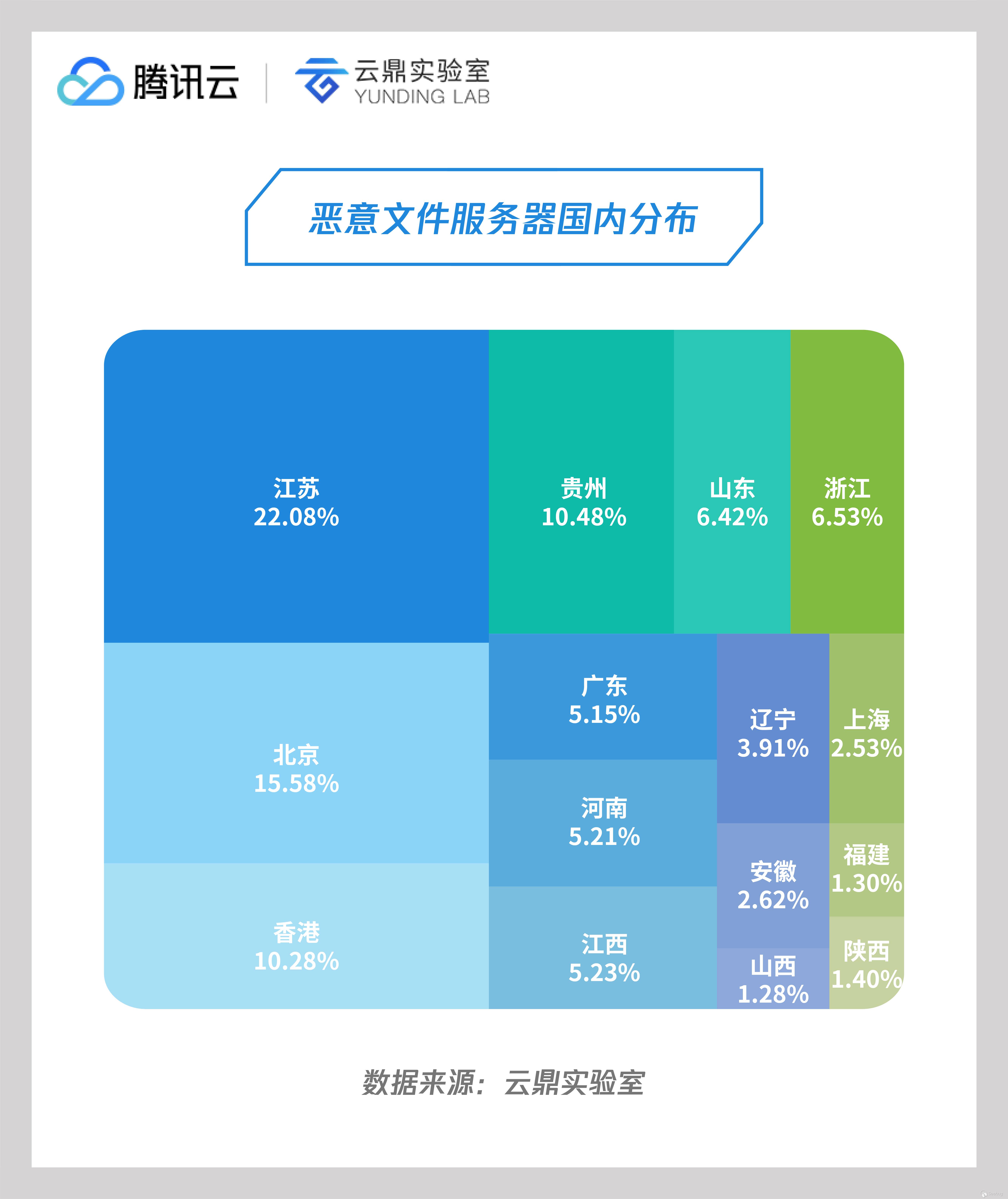 由于采集的大部分節點在國內,因此統計到67%的惡意文件服務器部署在國內,且沒有完全集中在互聯網產業發達的地區,廣東、上海占比就比較少。這是因為這些地區對服務器監管嚴格,因此攻擊者選用其他地區的服務器存放惡意文件。