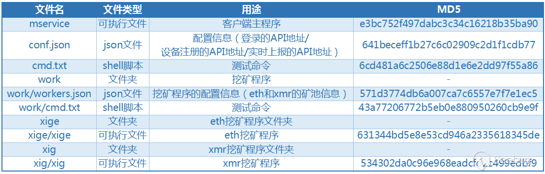 攻擊者植入的第二個惡意樣本是挖礦相關的。由于虛擬貨幣的興起,攻擊者開始利用被控制的設備進行挖礦來牟取利益。簡要的樣本信息如下: 植入的惡意樣本是「一路賺錢」的64位 Linux 挖礦惡意程序部署腳本,腳本執行后會植入「一路賺錢」 64位 Linux 版本的挖礦惡意程序壓縮包,并解壓到 /opt 目錄下,然后運行主程序 mservice,注冊為 Linux 系統服務,服務名為 YiluzhuanqianSer。該文件夾中有三個可執行文件 mservice / xige / xig,均被反病毒引擎檢測出是挖礦類的惡意樣本。根據配置文件可知, mservice 負責賬號登錄/設備注冊/上報實時信息,而xige 和 xig負責挖礦, xige 挖以太幣 ETH,xig 挖門羅幣 XMR。