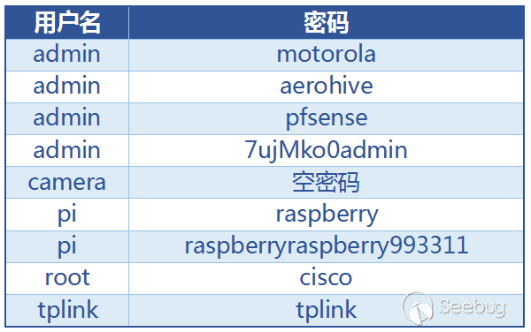 除此之外,還發現針對特定物聯網設備(比如攝像頭、路由器、防火墻、樹莓派等)的 SSH 暴力破解攻擊。這些攻擊使用了表2所示的用戶名密碼組合。