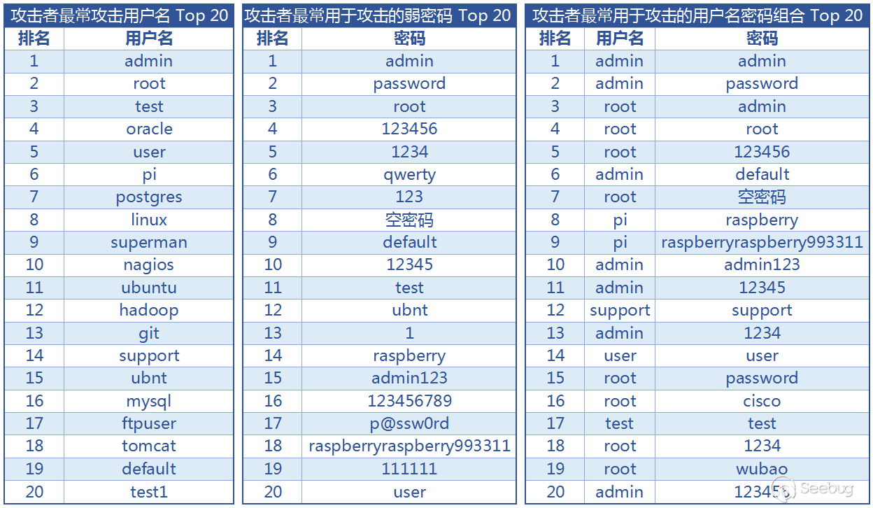 - 大部分攻擊都是針對 Linux 服務器默認管理賬號 root,攻擊者主要使用 admin、 root、 123456等常見弱密碼進行暴力破解;