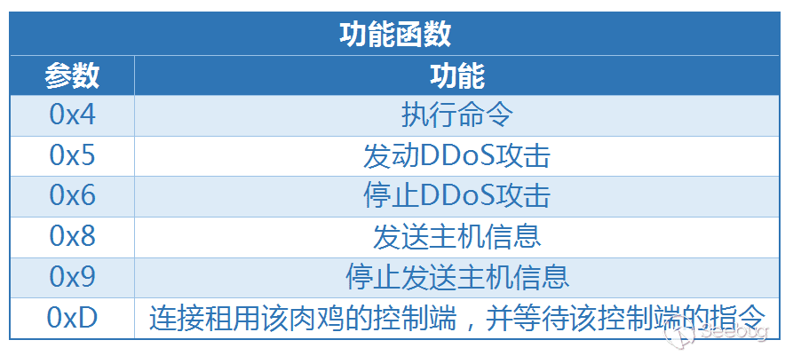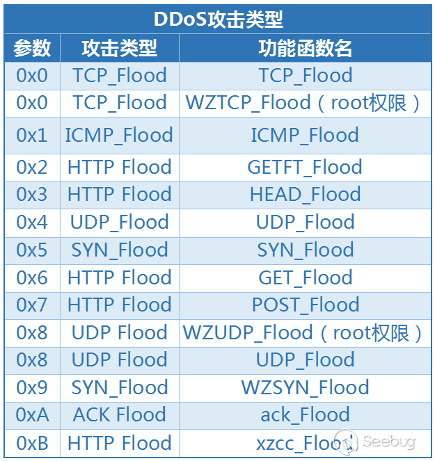 - 該樣本具有7種 DDoS 攻擊類型,13個 DDoS 攻擊函數,詳情如下表: