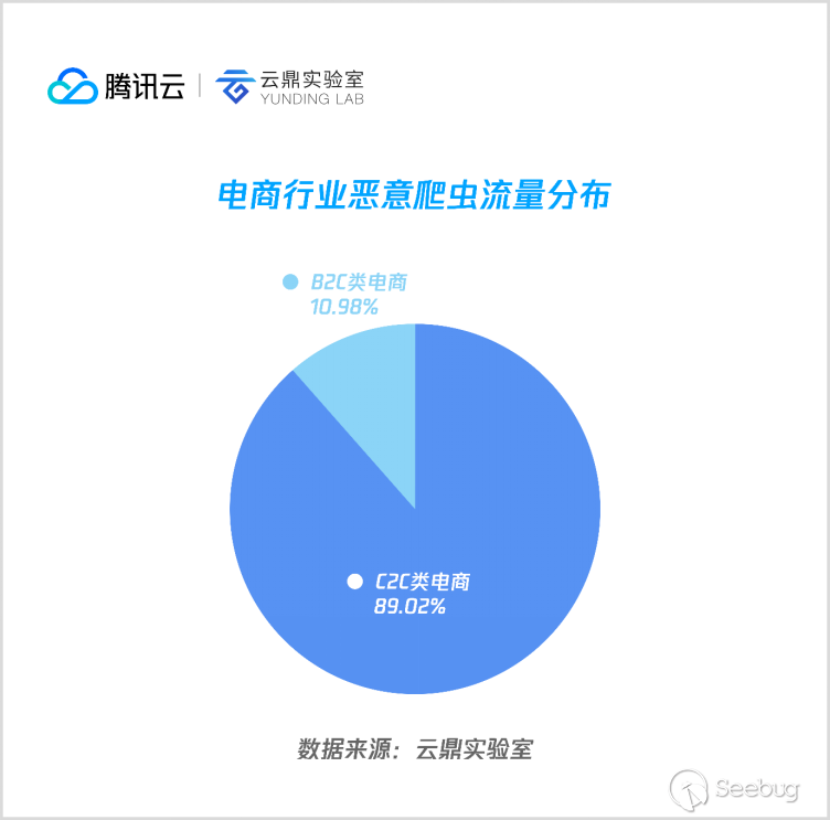 電商行業爬蟲主要是爬取商品信息和價格等數據,由于商業模式的差異,C2C 類電商由于中小賣家眾多,商品數量遠多于 B2C 類電商,支撐了電商類惡意爬蟲近90%流量, B2C 類電商加起來占一成左右。