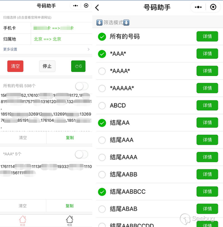 網絡上存在多種通過爬蟲技術進行靚號手機號搜索的工具,選擇手機卡類型,再不斷爬取待售手機號,尋找到符合理想靚號規則的號碼。下圖為某掃號工具截圖,可選擇數十種不同的互聯網套餐卡: