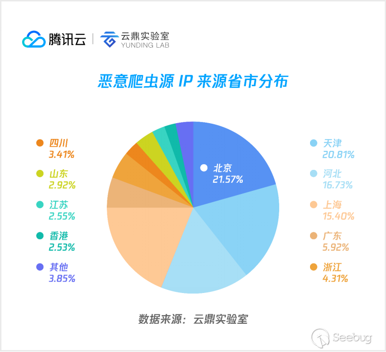 將源自國內的數據抽出來進行細分,可以看到,主要來自北京、天津、河北、上海等省市,以上4個地區所占國內惡意爬蟲流量超70%。這并不是因為爬蟲作者都來自這些地區,而是因為大量的爬蟲部署在租用的 IDC 機房,這些機房大多在發達省市。