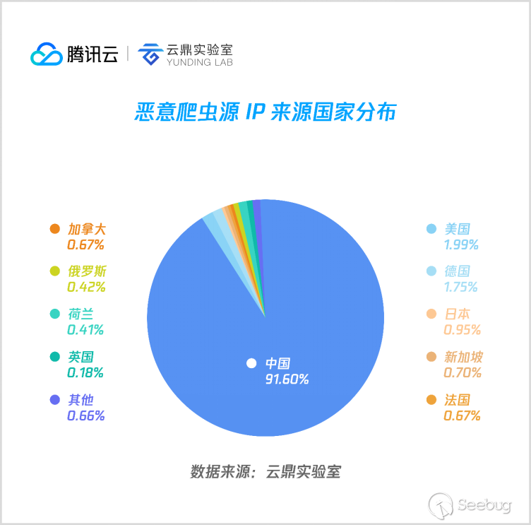 從本次半年度統計捕獲到的爬蟲流量源 IP來看,大部分都來自國內,超過90%,其次主要來自美國、德國、日本等國家。
