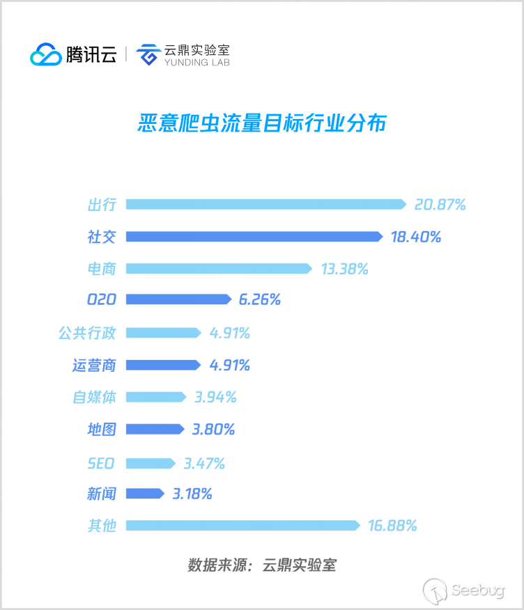 由統計可見,出行類惡意爬蟲流量占比高于電商與社交行業,居首位,其次是點評、運營商、公共行政等。接下來逐個行業進行分析: