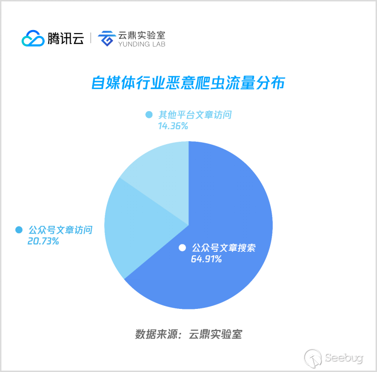 根據本次統計,自媒體類爬蟲主要集中于微信訂閱號關鍵詞搜索和文章訪問,分別占總量的64.91%和20.73%,其他自媒體平臺約占14.36%。