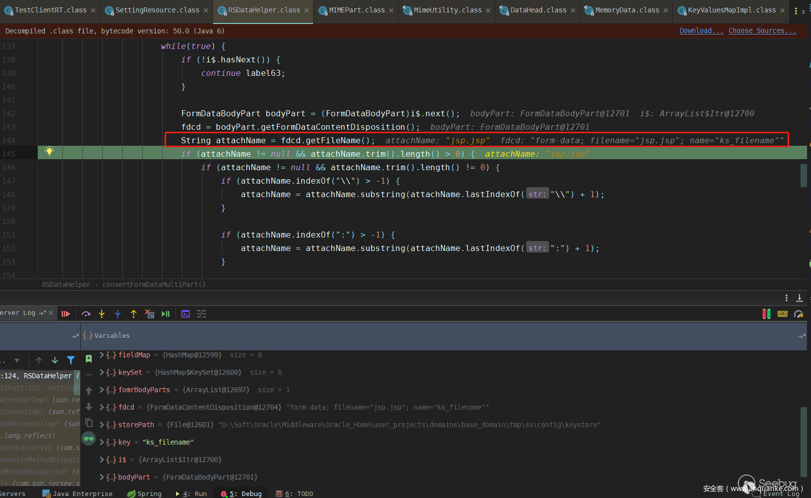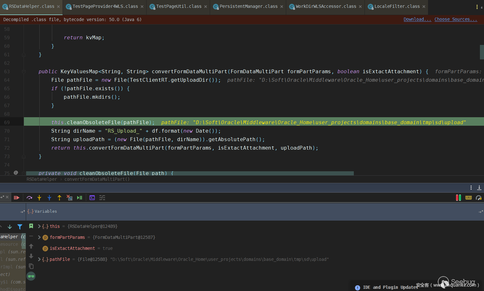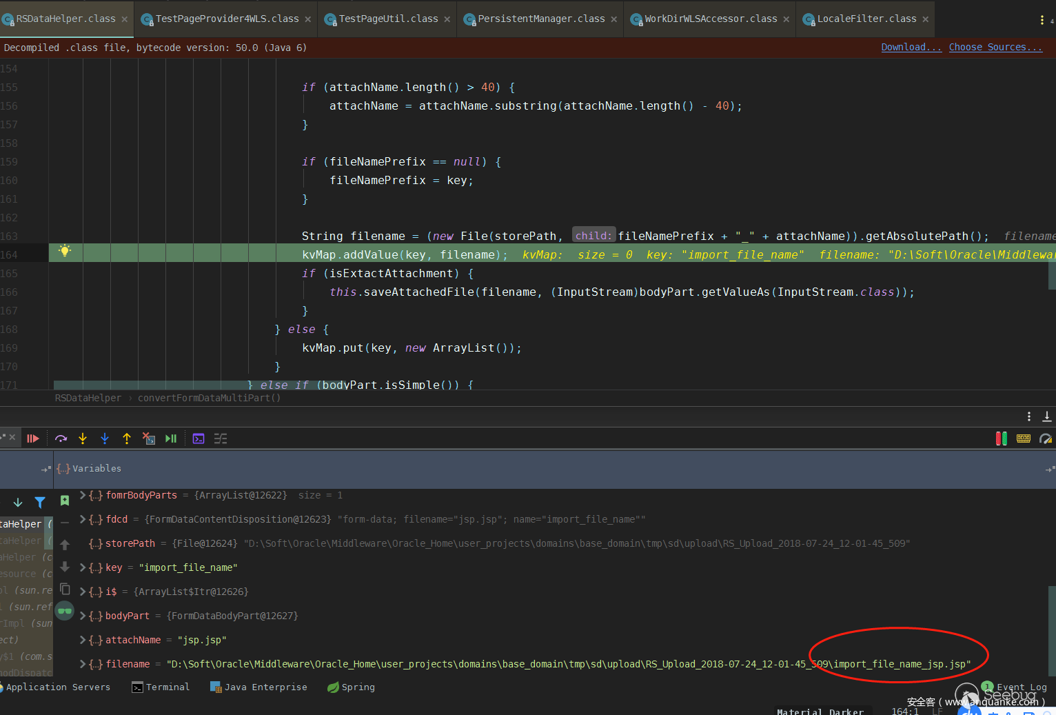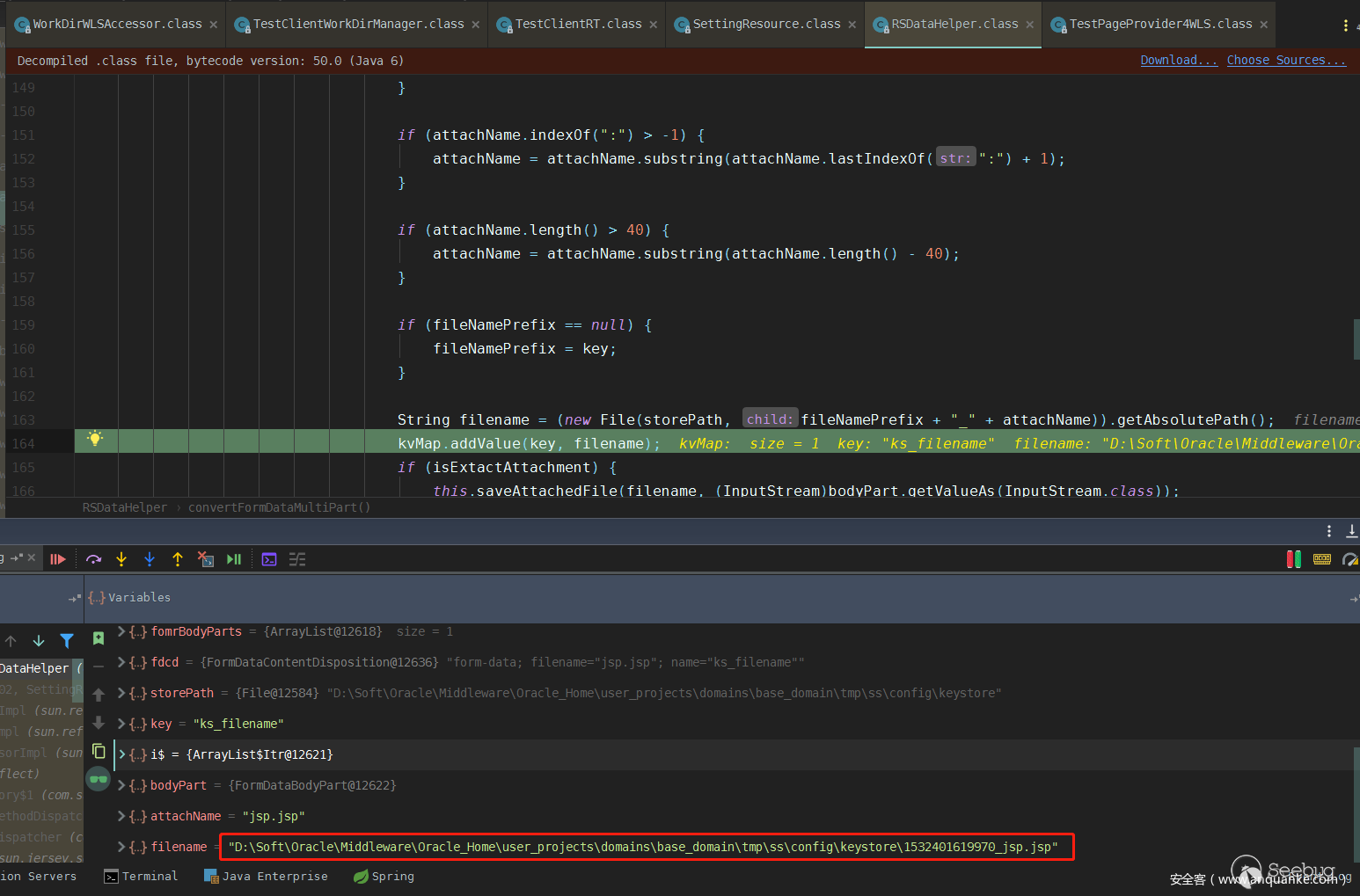 和之前的套路一樣,上傳的時候就已經打開了IDE調試功能,斷點后還是定位到 RSDataHelper.class 文件,如下圖