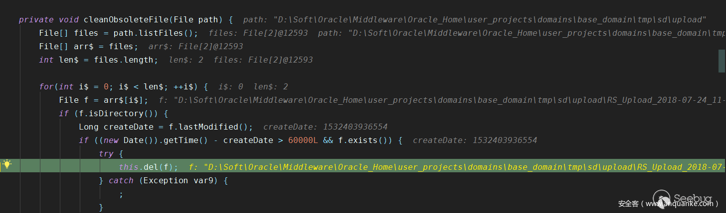 代碼中檢查了當前工作目錄下是否存在upload目錄,如果沒有的話則創建,并且調用了cleanObsoleteFile方法強制遍歷了一次目錄中所有的文件,并且發現文件就刪除掉,調試過程如下圖