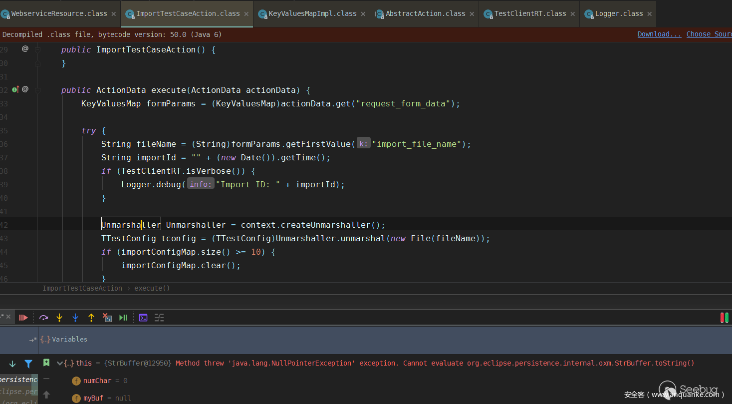 由于筆者導入的文件格式以及數據并非weblogic能處理的,所以程序在context.createUnmarshaller方法處拋出空指針異常的錯誤,這就導致了上傳成功后Response的狀態碼是500,這也可以作為防御產品檢測的特征之一。動態調試異常如下圖