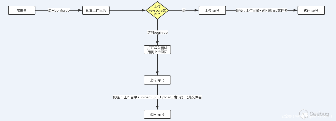 工作臺設置一個新的目錄后,weblogic會將原來目錄下的子目錄和文件一起轉移到新設定的目錄下,但舊的目錄依然保留。因為不是重點,筆者對這塊的分析就此略過。筆者從攻擊者的維度簡單的畫了一個草圖,最初攻擊者肯定需要配置工作目錄,因為默認的工作目錄在URL訪問的時候不可達,然后攻擊者考慮是從config.do頁面上傳keystore文件還是從begin.do上傳,最終都是成功上傳小馬,只是小馬的訪問格式和路徑不盡相同。如下圖