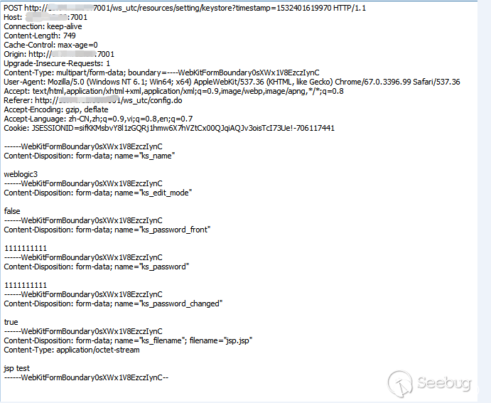 點擊提交后,抓取觸發地址: http://IP/ws_utc/resources/setting/keystore?timestamp=1532400069848 ; 抓取的包如下