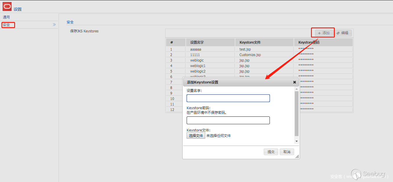 訪問 http://IP:7001/ws_utc/config.do 頁面后點擊左側的“安全”菜單,添加一個Keystore,任意設置名字和密碼,當然文件也是任意格式上傳,這里真的很隨意。