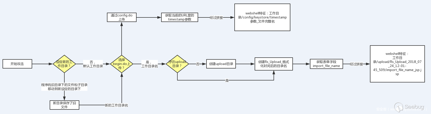 如果要從原理上徹底搞清楚weblogic漏洞產生的過程還需要看下圖,簡單的描述一下,攻擊者開始攻擊后,Weblogic在服務端做了很多的判斷,如果設定了新的工作目錄,那么程序會自動拷貝所有舊目錄下的子目錄和文件到新的設定目錄里,并且設定新的目錄作為工作目錄,如果攻擊者通過begin.do上傳的話,Weblogic在服務端會判斷有沒有upload目錄,如果不存在會自動創建,再接著在upload目錄下創建Rs_Upload_格式化后的作為目錄名,緊接著獲取到import_file_name字段名作為后續的文件名拼接的一部分;如果通過config.do上傳的話就獲取GET請求中的timestamp參數作為后續webshell的文件名中的一部分,還是看下圖吧: