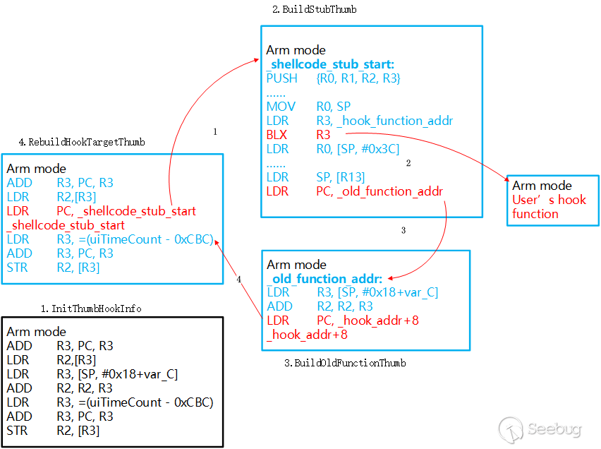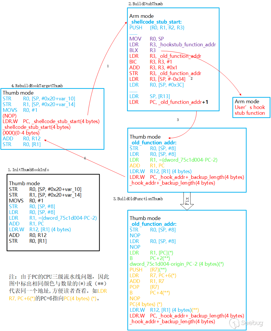 以上是本工具在arm指令集上的Native Hook基本方案。那么在thumb-2指令集上該怎么辦呢?我決定使用多模式切換來實現(文末解釋2),整理后如下圖:
