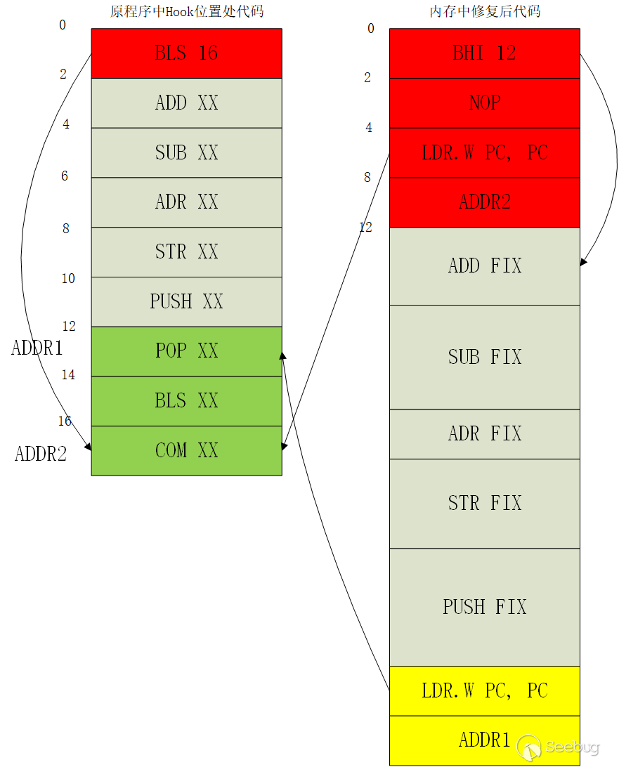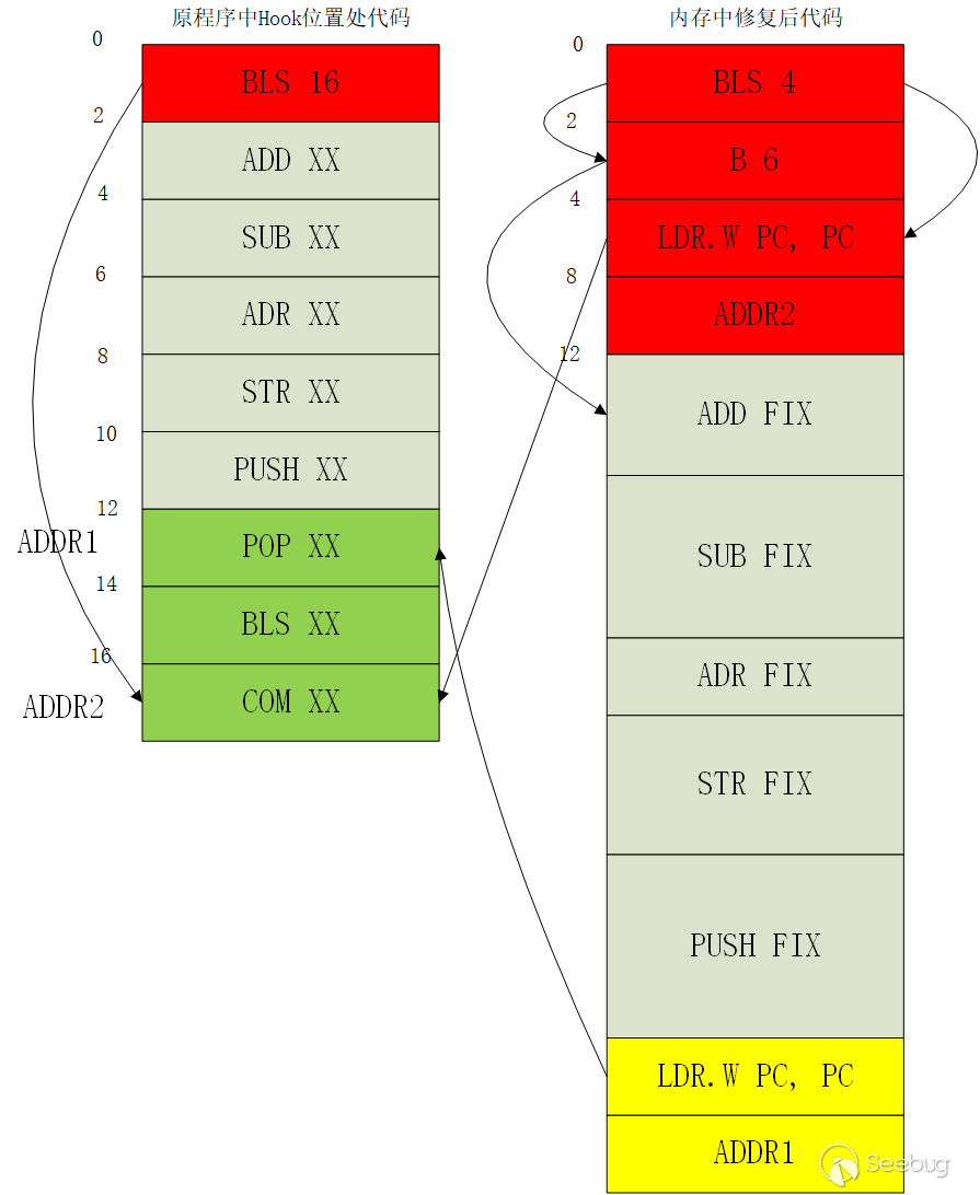 - Thumb-2模式在備份時,12 Bytes最大是可能備份6條Thumb16指令的。也就是說,可能在備份指令中出現多條條件跳轉指令,這時候會出現跳轉嵌套,如下圖: