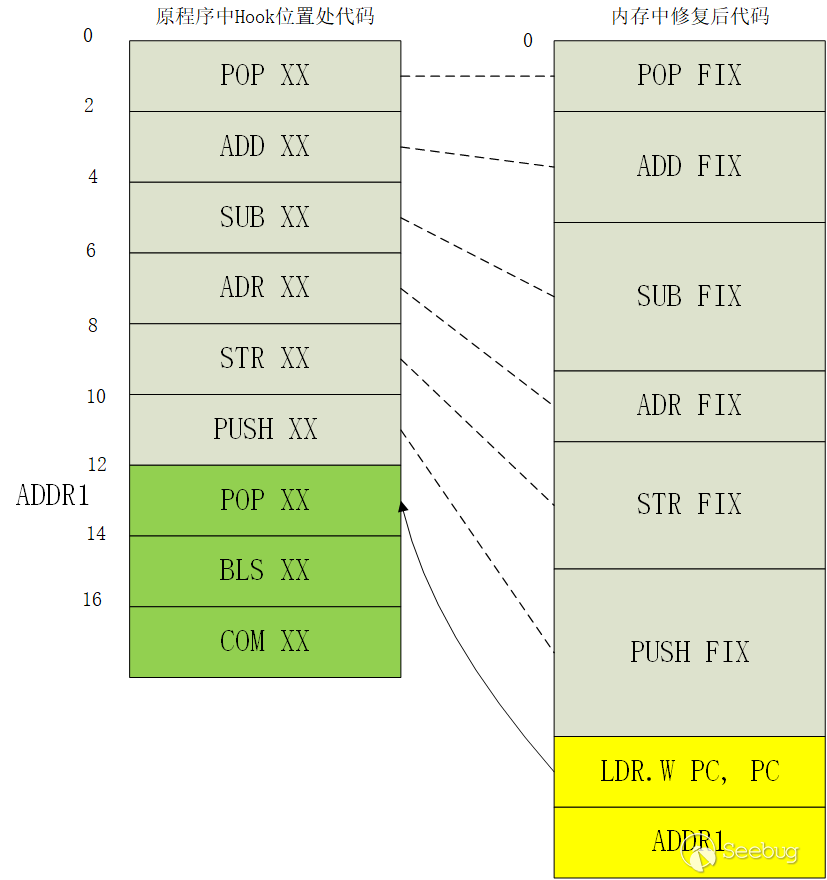 第一步,根據/proc/self/map中目標so庫的內存加載地址與目標Hook地址的偏移計算出實際需要Hook的內存地址。將目標地址處的X Bytes的thumb匯編代碼進行備份。然后用一條LDR.W PC指令和一個地址(共計8 Bytes)替換它們。這樣就能(以arm模式)將PC指向圖中第二部分stub代碼所在的位置。由于使用的是LDR.W而不是BLX,所以lr寄存器不受影響。