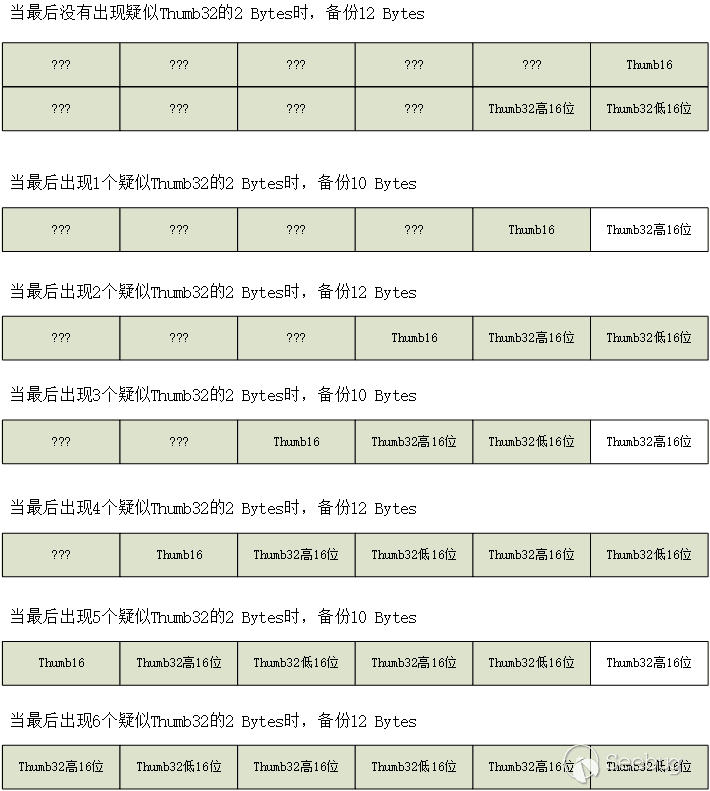 細節1:為什么說是X Bytes?參考了網上不少的資料,發現大部分代碼中都簡單地將arm模式設置為8 bytes的備份,thumb模式12 bytes的備份。對arm32來說很合理,因為2條arm32指令足矣,上文處理arm32時也是這么做的。而thumb-2模式則不一樣,thumb-2模式是thumb16(2 bytes)與thumb32(4 bytes)指令混合使用。本人在實際測試中出現過2+2+2+2+2+4>12的情形,這種情況下,最后一條thumb32指令會被截斷,從而在備份代碼中執行了一條只有前半段的thumb32,而在4->1的返回后還要執行一個只有后半段的thumb32。因此,本項目最初在第一步備份代碼前會檢查最后第11和12byte是不是前半條thumb32,如果不是,則備份12 byte。如果是的話,就備份10 byte。但是后來發現也不行,因為Thumb32指令的低16位可能會被誤判為新Thumb32指令的開頭。因此,最終通過統計末尾連續“疑似”Thumb32高16位的數量,當數量為單數則備份10 bytes,數量為偶數則備份12 bytes。這么做的原因如下:如果這個16位符合Thumb32指令的高16位格式,那它肯定不是Thumb16,只可能是Thumb32的高16位或低16位。因為Thumb16是不會和Thumb32有歧義的。那么,當它前面的16位也是類似的“疑似”Thumb32的話,可能是它倆共同組成了一個Thumb32,也可能是它們一個是結尾一個是開頭。所以,如果結尾出現1條疑似Thumb32,則說明這是一條截斷的,出現2條疑似Thumb32,說明它倆是一整條,出現3條,說明前2條是一條thumb32,最后一條是被截斷的前部分,依此類推。用下面這張圖可能更容易理解,總之:疑似Thumb32的2 Bytes可能是Thumb32高16位或Thumb32低16位,但不可能是Thumb16: