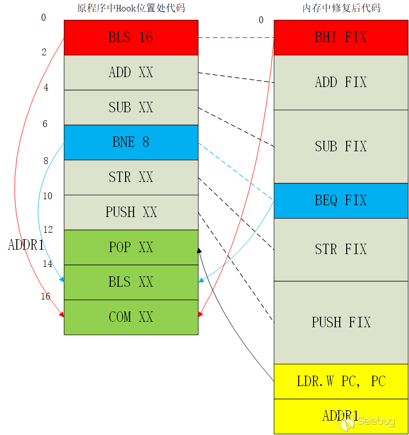 12 Bytes的備份代碼與各自對應的修復代碼自上而下一一對應,尾部再添加個跳轉回原程序的LDR。這就是上文中設想的最標準的修復方式。然而當其中混入了一條條件跳轉指令后: