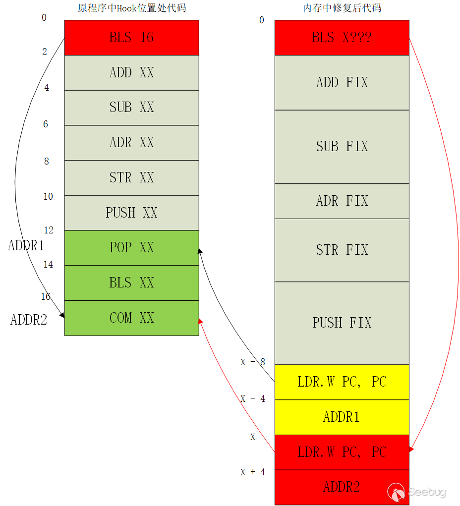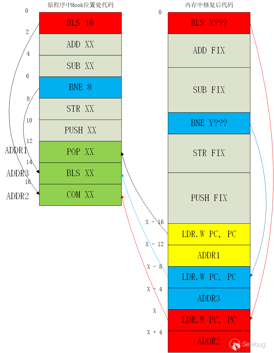 - 圖中X的值如何確定?我們是從上到下一條條修復備份指令然后拼接的,也就是說這條BLS指令下方的指令在修復它的時候還沒被修復。這樣這個X的值就無法確定?