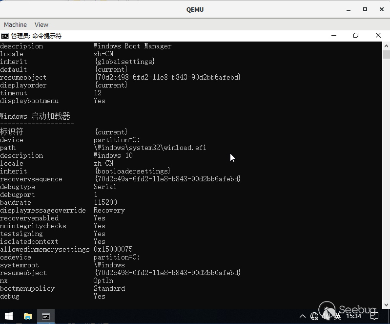 在qemu環境下,我們使用Linaro.org網站提供的針對QEMU(AARCH64)的1708版的UEFI文件QEMU_EFI.fd啟動Win10ARM64的系統,并使用bcdedit修改qemu模擬器里的Win10ARM64的啟動配置以實現遠程內核調試。配置如下圖,