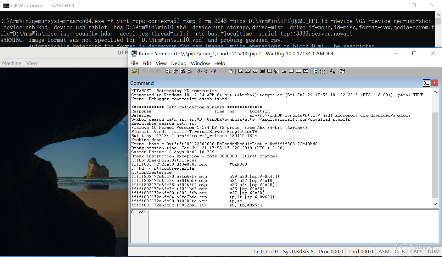 今年6月,微軟聯合一線筆記本廠商正式發布了搭載高通驍龍處理器的Windows 10筆記本產品。作為主角的Win10 ARM64,自然亮點無數,對PC設備廠商也是各種利好。實際上,為了與廠商同步發布安全防護產品,IceswordLab的小伙伴早已將底層驅動程序集移植到了Win10 ARM64平臺上,筆者也因此積累了一些有趣的內核調試方法。在x86平臺使用vmware等虛擬機軟件搭建遠程內核調試環境是非常方便有效的辦法,但目前Win10 ARM64平臺沒有這樣的虛擬機軟件,于是筆者利用qemu模擬器DIY一個。
