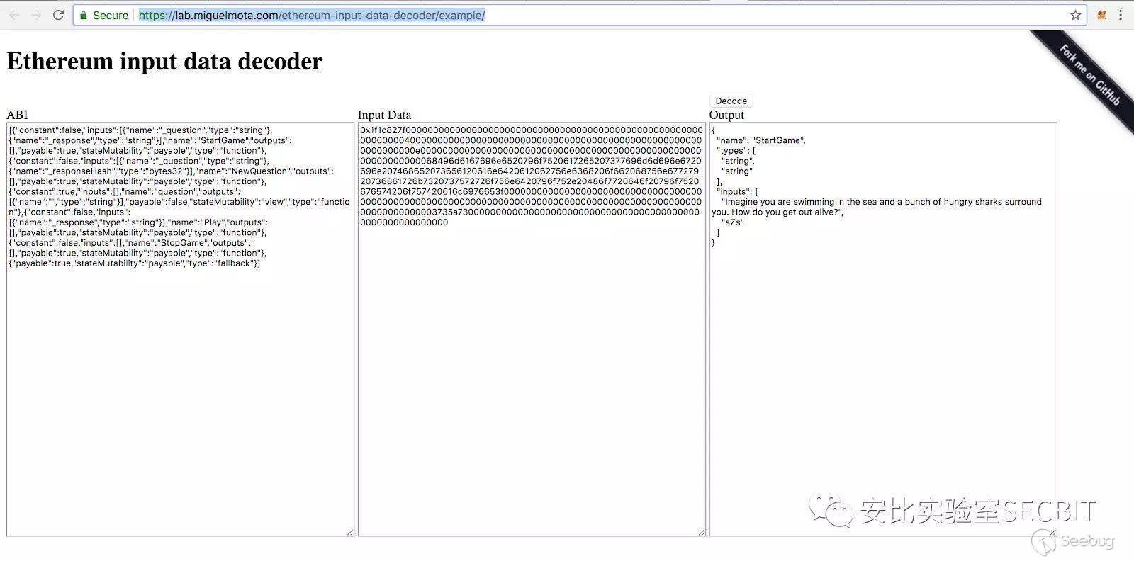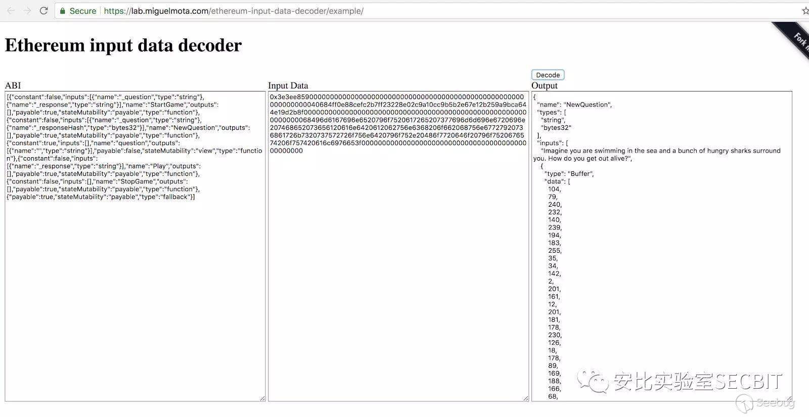 從解碼后的結果來看,第一次是調用了 StartGame() 接口,傳入的參數,其中 _question 為 Imagine you are swimming in the sea and a bunch of hungry sharks surround you. How do you get out alive? , 答案為 sZs。第二次調用是 NewQuestion() 接口,更新了問題和答案,傳入的問題與上一次調用一致,答案是一串小安比看不太懂的鬼東西。