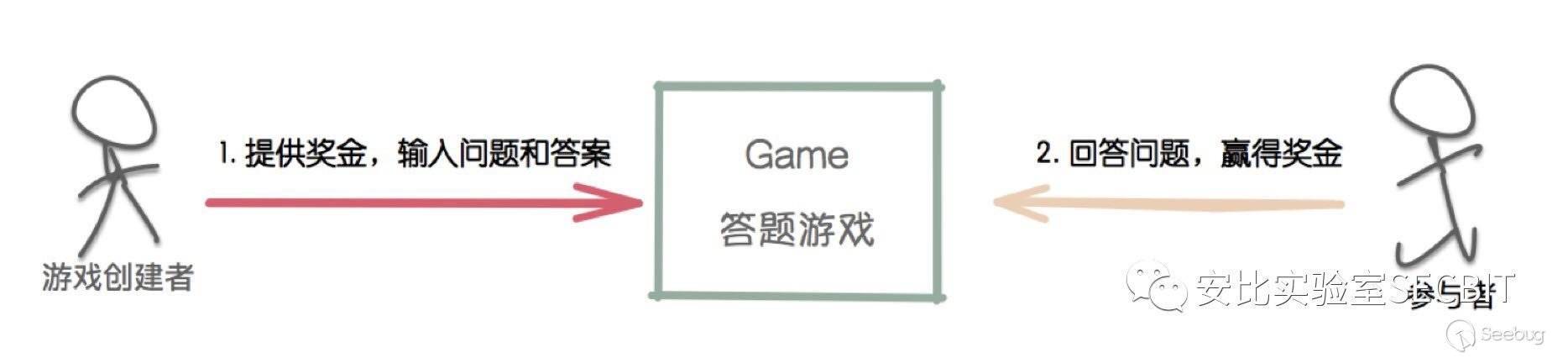 從 QUESTION 合約源碼看,游戲創建者設置問題和答案,啟動游戲,任何人皆可以玩家身份參與游戲,轉入不低于1 ETH 的手續費猜答案,猜中者將收獲合約中所有的 ETH,猜不中手續費自動打入合約地址。