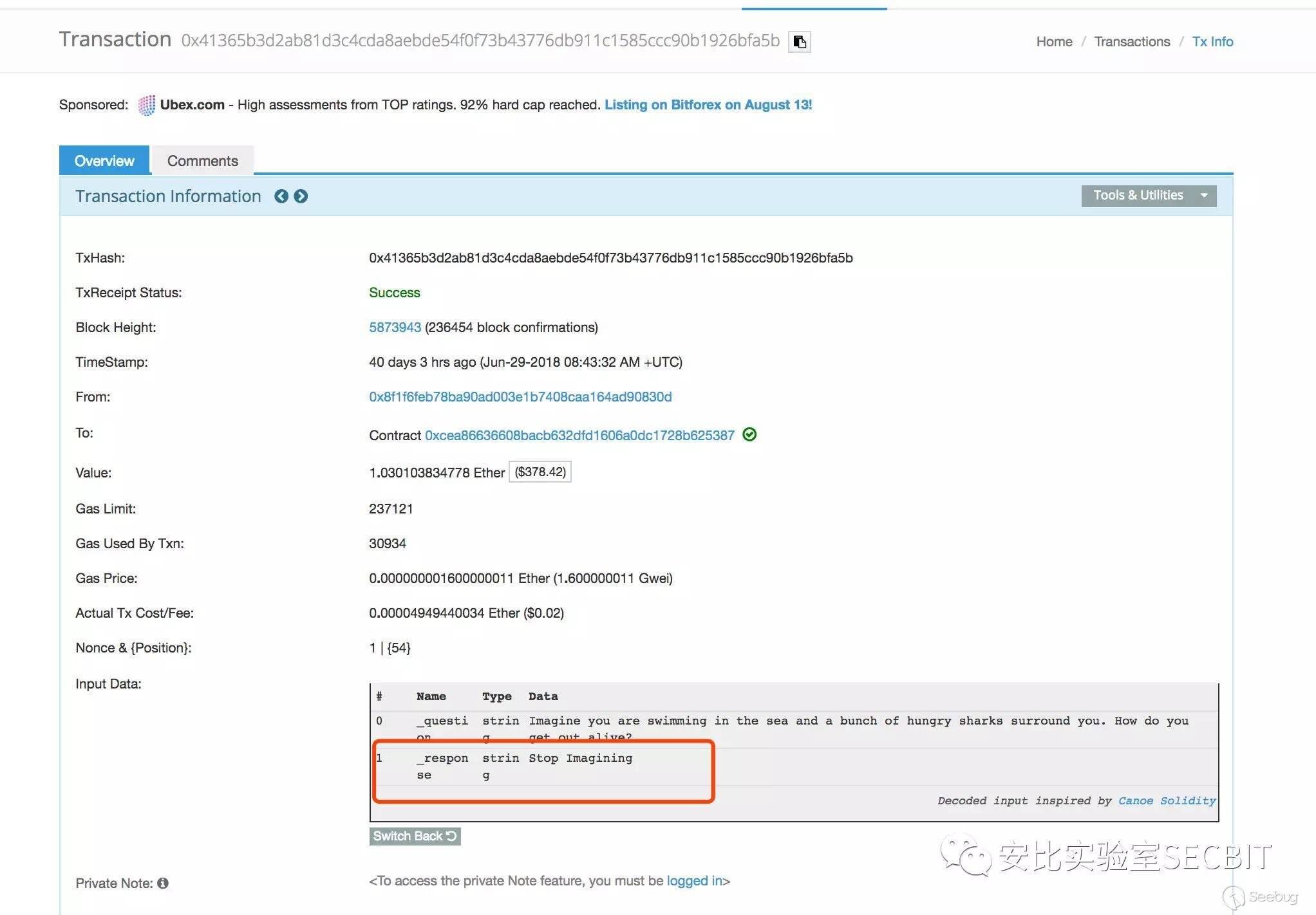 說到這,小安比突然發現,雖然都是傳入問題和答案,但是StartGame() 和 NewQuestion() 接口傳入的參數卻有所區別。StartGame() 函數傳入的第二個參數是問題答案的明文。然鵝,以太坊上接口調用的參數是可以查詢到的!!!也就是說只要找到啟動游戲的那筆交易,就可以找到問題的答案。小安比不禁露出了狡黠的笑容。