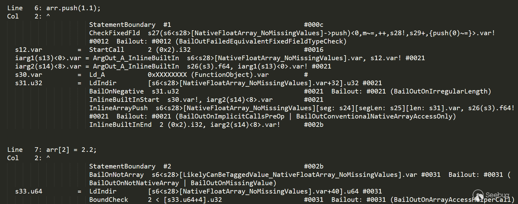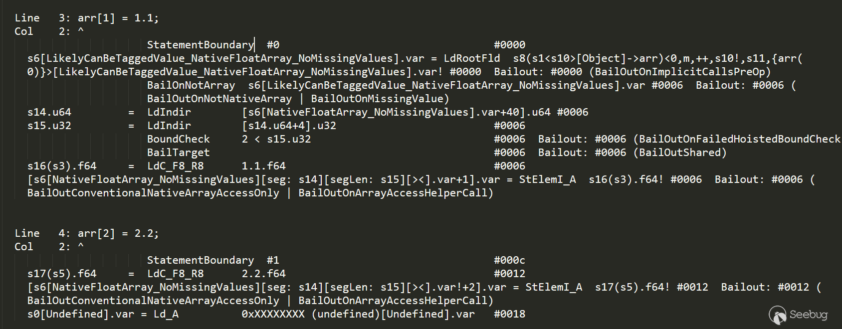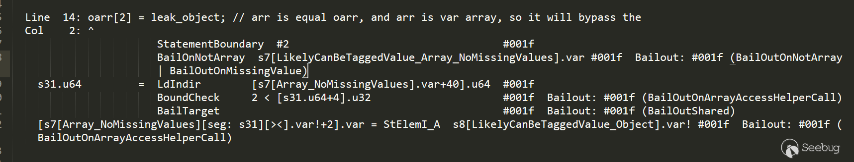 的任何bailout.下面查看|oarr[2] = leak_object|生成的對應IR信息: