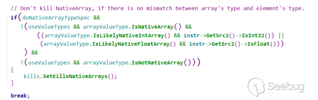 這里明顯中間有一個回調,所以我們是需要把chakra中已經保存的type信息去掉,這時候chackaCore就引入了一個kill機制,其中一個相關的處理代碼是在|GlobOpt::CheckJsArrayKills|.在審閱這個函數的時候,InlineArrayPush opcode引起了我的注意: