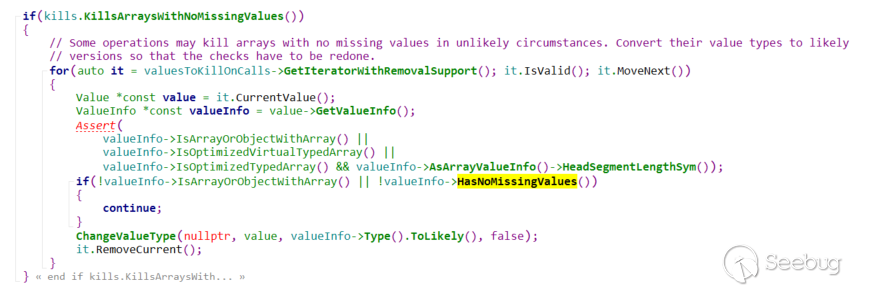 原來如果chakraCore覺得arr的type信息中沒有MissingValues,在經過push后,還是會把arr的type信息刪去,當然這個十分容易bypass,只需要令|valueInfo->HasNoMissingValues|返回false,就會進入continue語句.換句話說,就是需要我們傳入的arr中帶有MissingValues.所以最后的PoC也就呼之欲出: