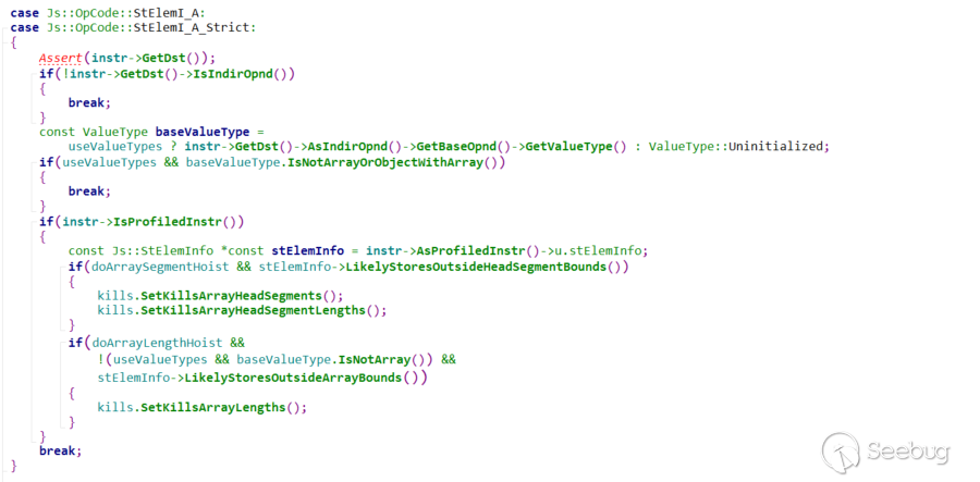 最后一句是最關鍵的代碼,我們可以看到,|arr[0] = 1.1|和|return arr[2]|中有兩行代碼,這兩行代碼必須不能kill |arr|的type信息,否則就會重新類型檢查,因為arr已經轉變成var array類型了,如果此時有類型檢查就會檢查失敗然后bailout.上文已經詳細分析了如果arr NoMissingValues為false,|arr.push(value)|是不會kill arr的type信息的.所以現在剩下|oarr[2] = leak_object|這句,對應的opcode是StElemI_A,|CheckJsArrayKills|代碼如下: