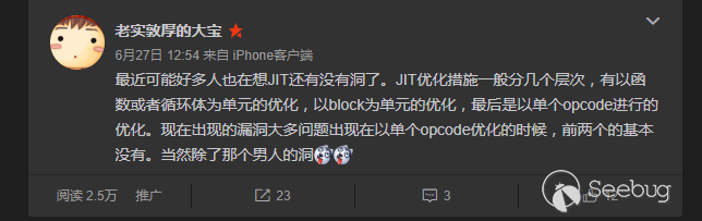 在這個bug中,我們可以看到,不需要觸發任何的回調,最后我們成功利用了這個bug達到任意對象地址泄露和任意地址對象fake.關于這個bug的利用我個人覺得還是有點技巧的,而這個bug的根本原因就是開發人員忘記了push中的一些特殊情況而導致的過激優化,我們需要時刻記著,在保持性能優化的同時,也要注重安全.
