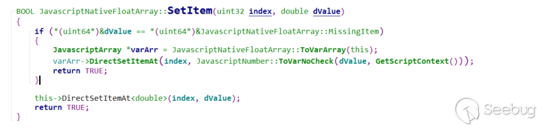 可以看到,arr[1]在內存的值是0x8000000280000002,這時候敏銳的讀者可能就會想到了,這個值是在浮點數的表示范圍內啊(詳情查看IEEE 754),通過轉換,我們可以知道這個值對應浮點數-5.3049894784e-314.所以為了區分-5.3049894784e-314和undefined,chakraCore在float Array的|setItem|有一個特殊的處理:
