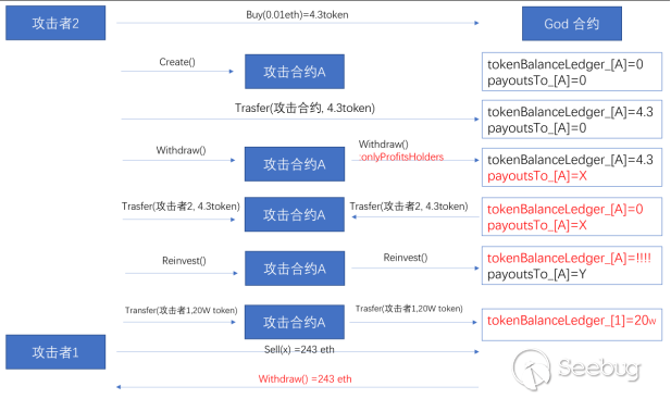 攻擊合約在reinvest調用之前只執行過transfer調用和withdraw調用。其中transfer調用從攻擊合約轉token到外部賬戶,所以不會修改合約的payoutsTo_值,但withdraw函數會直接修改合約的payoutsTo_值。因此,只要在reinvest之前調用一次withdraw函數就可以使得減法的第二操作數為一個正數。