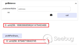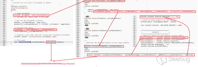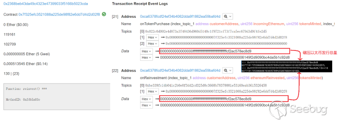 通過這個事件的記錄數據,可以看到該reinvest調用使得合約判定購買token的以太代幣數量為一個大數,并且遠遠超出以太幣發行總量。這個信息也反應出reinvest函數內部邏輯一定產生了某種非預期的行為。