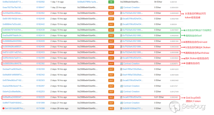 從攻擊者1的交易來看,它發往God合約的最早交易是sell調用,說明在sell之前它就已經有了God合約的token。那么攻擊合約在此之前,肯定有其它賬戶給它轉移過token。否則,它不會有可以sell的token。