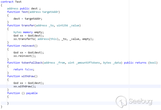 8月19日,God.Game在以太坊區塊鏈上部署了自己的智能合約(地址位于https://etherscan.io/token/0xca6378fcdf24ef34b4062dda9f1862ea59bafd4d,簡稱God合約),時隔一天攻擊者就盜取了該合約的243個以太幣,價值超過6萬美元。啟明星辰ADLab在監控到該事件后,對該攻擊進行了詳>,簡稱God合約),時隔一天攻擊者就盜取了該合約的243個以太幣,價值超過6萬美元。啟明星辰ADLab在監控到該事件后,對該攻擊進行了詳細的分析和重現。