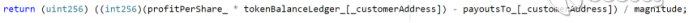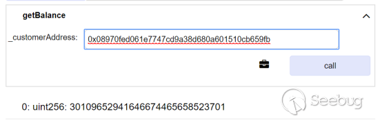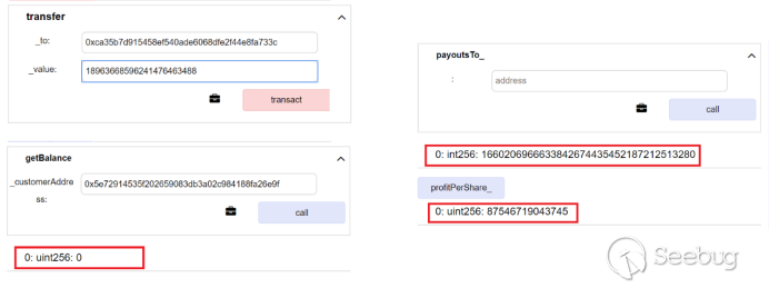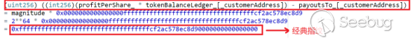 繼續構造上述的操作數。首先,tokenBalanceLedger_[_customerAddress]在合約調用的上下文中表示調用者持有的token。因此,只要調用者不持有合約token,這個值就是零。此時無論profitPerShare_值為多少,乘法結果都為零。這樣減法的第一操作數為零的條件,就輕易構造出來了,即調用者不持有God合約token。然后,payoutsTo_是一個mapping對象,合約調用者的初始值為零,需要使其為一個正數。