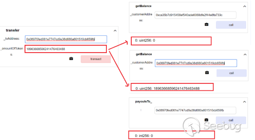 7)調用攻擊合約Test的transfer函數把token全部給創建者,Test此時擁有的token為0,payoutsTo_為大數;