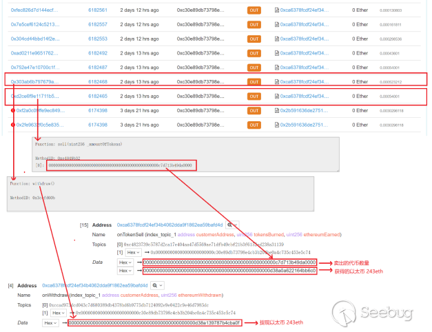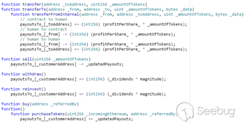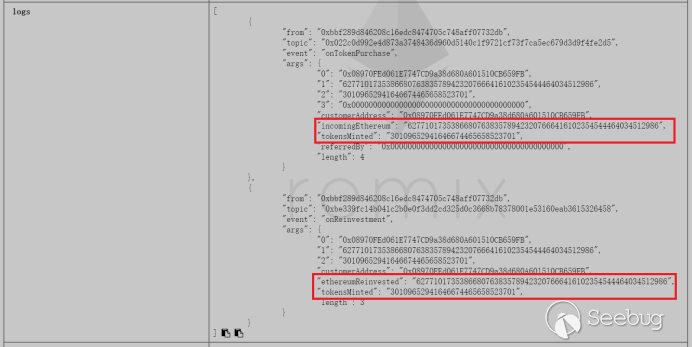 接著分析這個reinvest交易,它是直接調用不開源的攻擊合約,其內部機制我們并不清楚。但是,這個交易過程會觸發God合約的兩個事件,onTokenPurchase和onReinvestment: