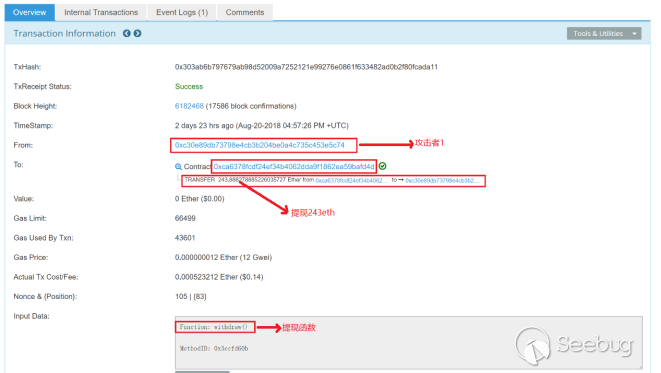 交易詳情如下,即攻擊者0xc30e89db73798e4cb3b204be0a4c735c453e5c74(簡稱攻擊者1)調用了God合約的withdraw函數進行提幣: