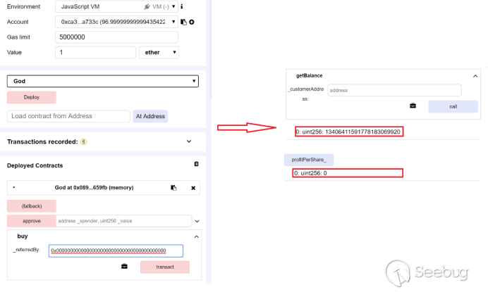 3)再用相同的參數來購買一次(一定要再來一次,因為此時合約的profitPerShare_仍然是零值,這會導致withdraw調用的函數修飾符失敗);