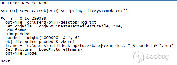 可以看到,我們確實命中了斷點,到這里為止,我們就很接近之前分析到的發生改變的代碼分支了,但是,實際上我們利用OpenMCDF生成的文件是一個正常的文件,也就是說其中包含的圖標的這個流也是正常的,那么接下來,我們使用dumb fuzzer(譯者注:dumb fuzz是一種fuzz技術,不管文件格式問題,完全采用生成全隨機化的數據來進行fuzz)的方法來生成畸形文件,通過一個vbscript的腳本來執行文件,再通過eEye公司的一款產品來自動化調試。當然,我們也要通過Windbg中個gflags開啟頁堆監視(譯者注:通過Windbg下的gflags.exe /I [process] +ust +hpa開啟頁堆監視)。