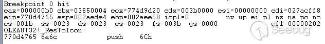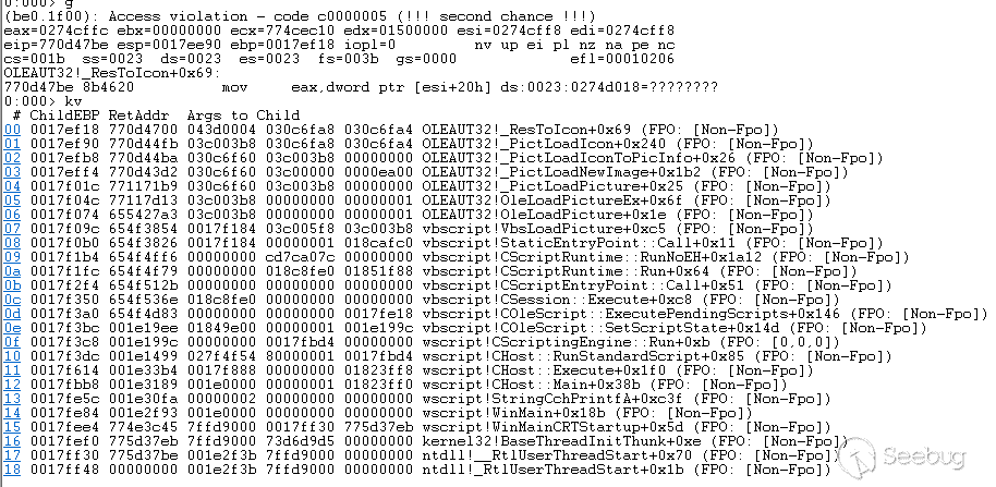 這樣修改之后,我們的文件打開之后,就能成功命中OleLoadPicture斷點了。接下來我們通過Windbg附加這個任務來跟蹤,同時在OLEAUT32.dll中的ResTIcon函數下斷點,來確定OleLoadPicture之后是否能夠命中我們分析到的漏洞觸發的關鍵函數。