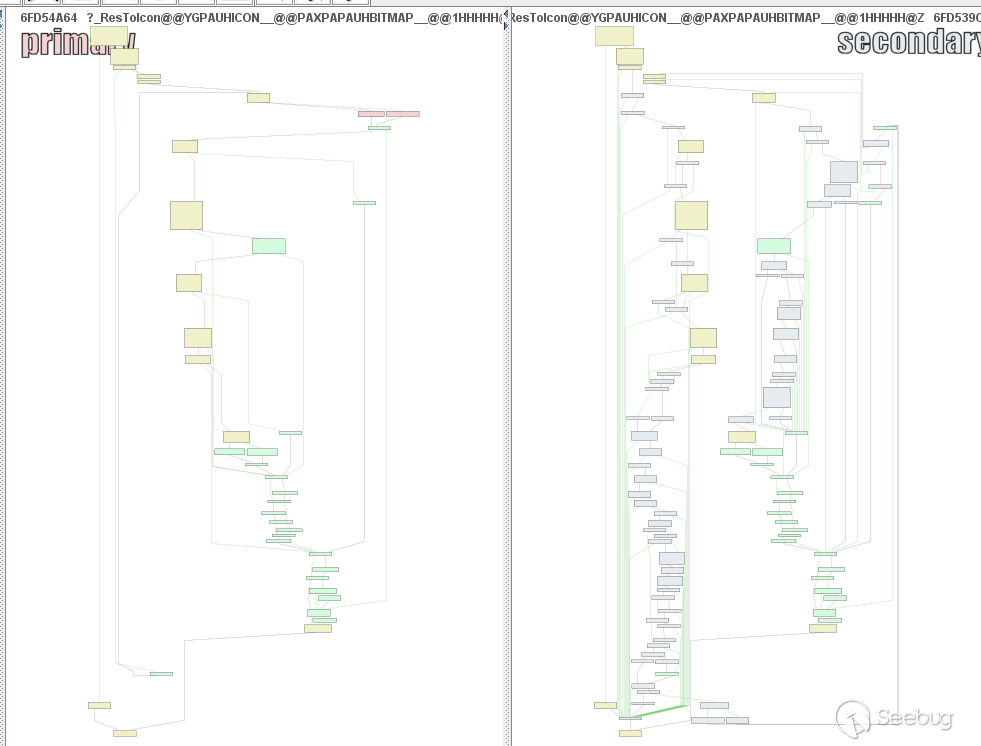 查看這個函數列表,我們選擇仔細閱讀OLEAUT32!_ResToIcon這個函數功能,不過我們也需要考慮到這個過程可能會涉及到其他函數的變動。那么首先我們這個函數可能是用來執行一些和圖標相關的一些功能,來看一下關于這個函數補丁前后的邏輯流程圖的對比。