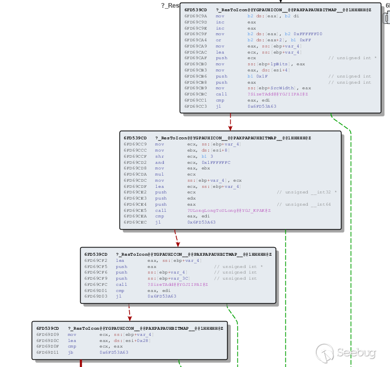 通過對這張流程圖前后對比中可以發現,關于ResToIcon函數在邏輯執行流程上有很多變化,但是我們需要考慮每一個代碼塊執行的變化是否是由于存在安全漏洞才改變的,讓我們重點來分析每一個代碼塊。